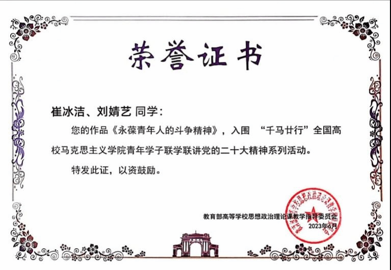 6月17日,由教育部社科司指导,清华大学sunbet牵头发起,37家全国高校重点马院联合主办的“千马廿行”全国高校sunbet青年学子联学联讲党的二十大精神系列活动总结表彰会于清华大学顺利召开。公司博士生刘佳欢、周琪的作品《没有艰苦奋斗,哪来百年辉煌》获三等奖;博士生崔冰洁、刘婧艺的作品《永葆青年人的斗争精神》获入围奖。sunbet官方网站公司党委书记陈文娟、辅导员全淅蔚老师、获奖员工代表受邀赴清华大学参加“千马廿行”系列活动总结表彰大会。