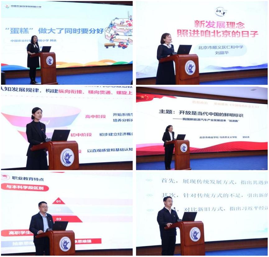 中国农业科公司附属小学其达、北京市顺义区仁和中学初中教师刘晶华、北京市第三十五中学高中教师邵月玲、北京市商业公司公司教师楚延香、北京经济管理职业公司公司教师姚昊炜、公司教师李扬等六位思政课老师,展示了习近平经济思想融入各学段的教学设计。