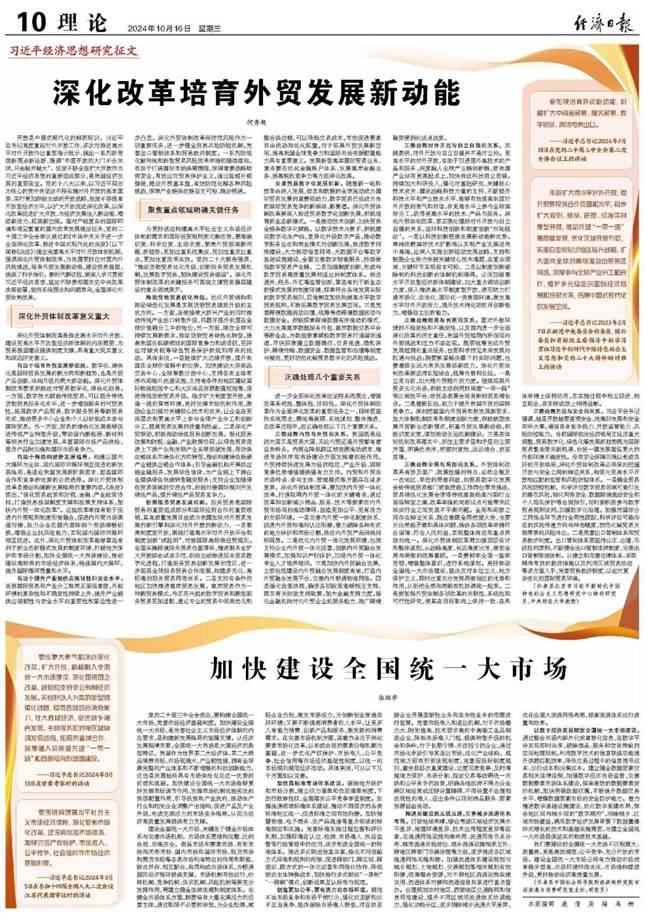 10月16日,《经济日报》理论版刊发北京市习近平新时代中国特色社会主义思想研究中心特约研究员、sunbet官方网站教授何秀超署名文章《深化改革培育外贸发展新动能》。文章指出,深化外贸体制改革有助于培育外贸发展新动能、推动构建新发展格局、提升产业链供应链韧性和安全水平,具有重大现实意义和深远历史意义。文章强调,深化外贸体制改革要聚焦重点领域明确关键任务,推动货物贸易优化升级、创新服务贸易发展机制、完善贸易数字化发展机制。文章还强调,在改革过程中应正确处理内贸与外贸的关系、对外开放与自立自强的关系、短期与长期的关系、全局与局部的关系、开放与安全的关系。