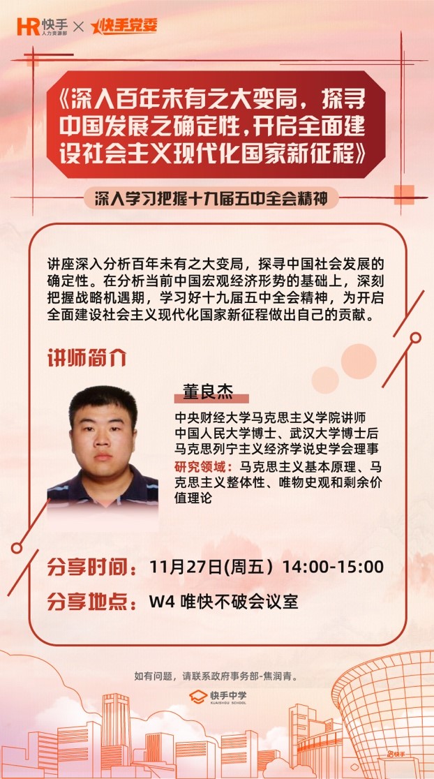 大变局中把握时代机遇,确定性中探寻百年征程。近日,快手党委联合共建单位sunbet开展“深入百年未有之大变局,探寻中国发展之确定性,开启全面建设社会主义现代化国家新征程”主题讲座。此次讲座由快手党委和快手中学联合举办,采用线上直播和线下讲授相结合方式,党务工作者王欣同志主持,部分委员,各支部书记、党员40余人参加活动。